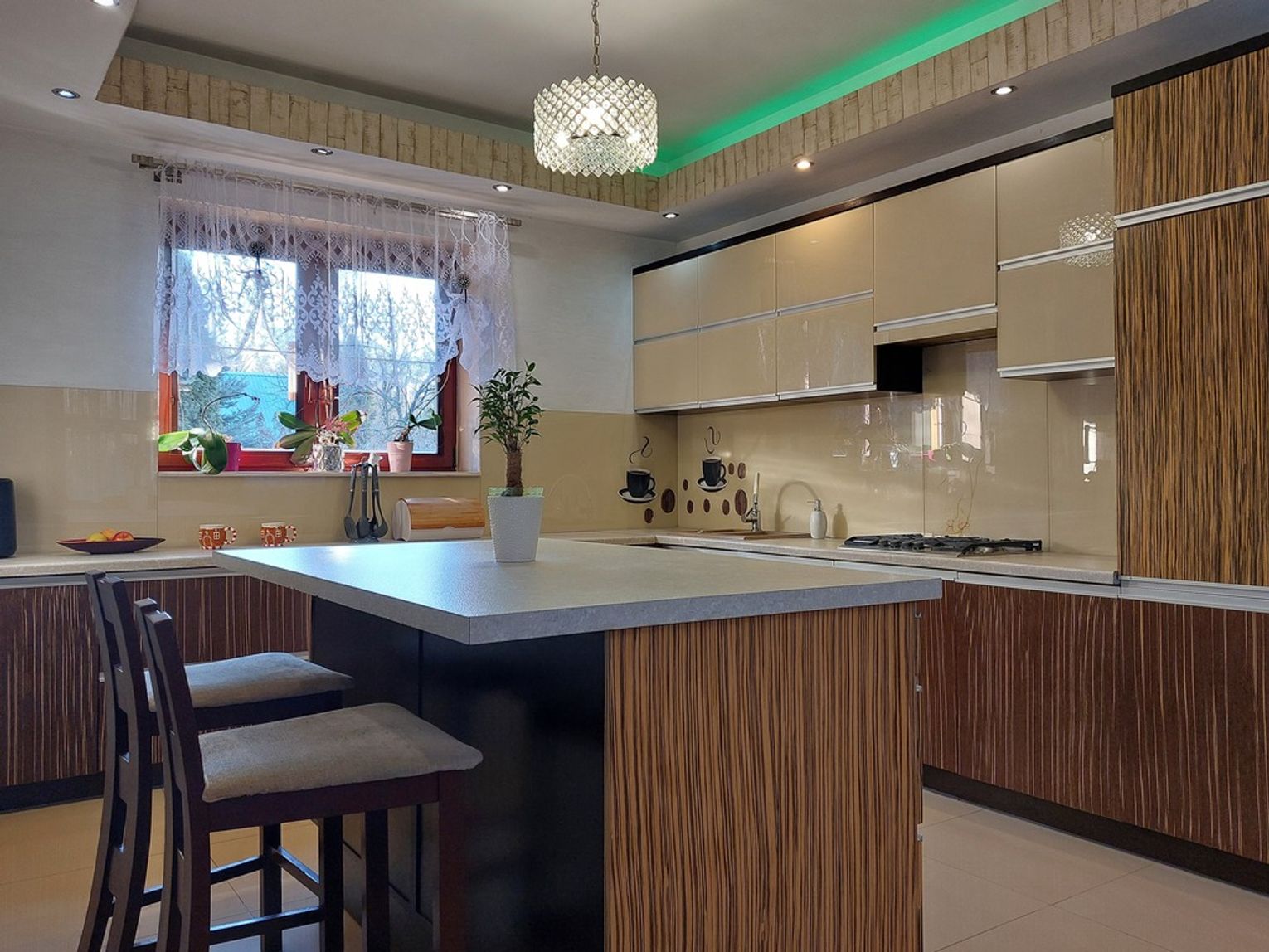 Dom posiada cztery sypialnie, duży salon z otwarta kuchnią, dwie łazienki, garaż w bryle budynku