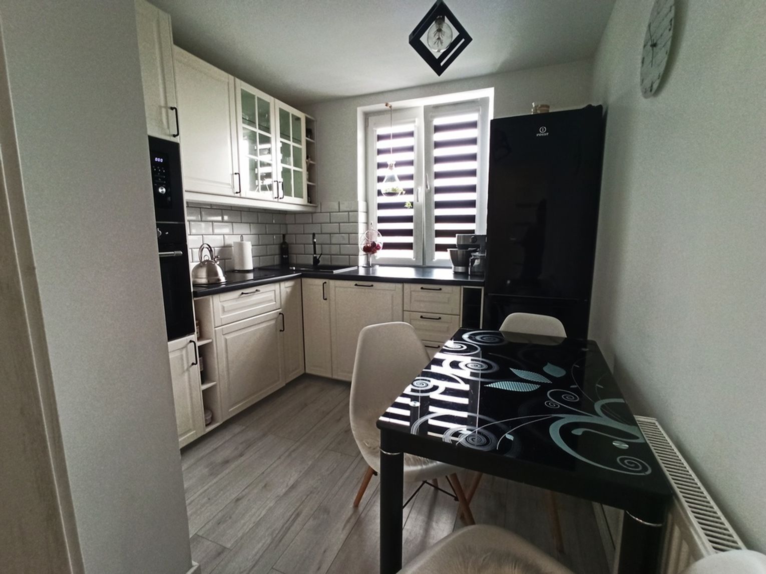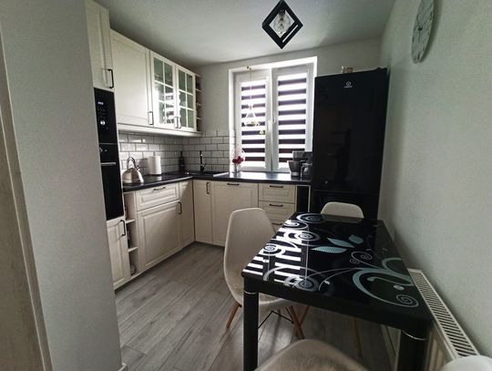 Mieszkanie wykończone na wysokim poziomie. Kuchnia jasna, meble w zabudowie, płyta indukcyjna, mikrofalówka w zabudowie.
