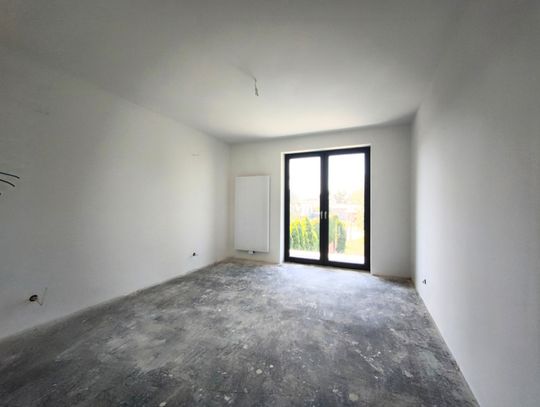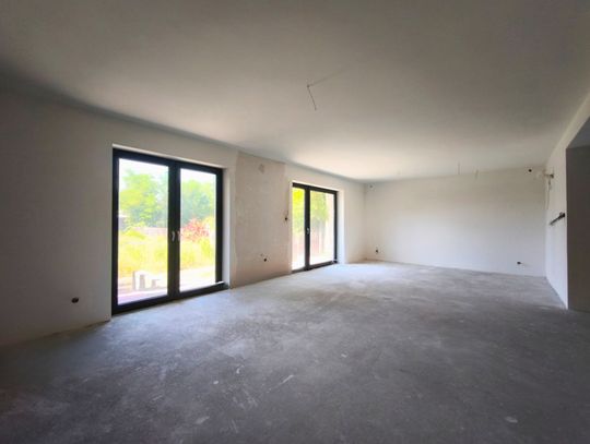 Duży, jasny salon z wyjściem na taras i ogród, garderoba, łazienka oraz przestronny przedpokój.