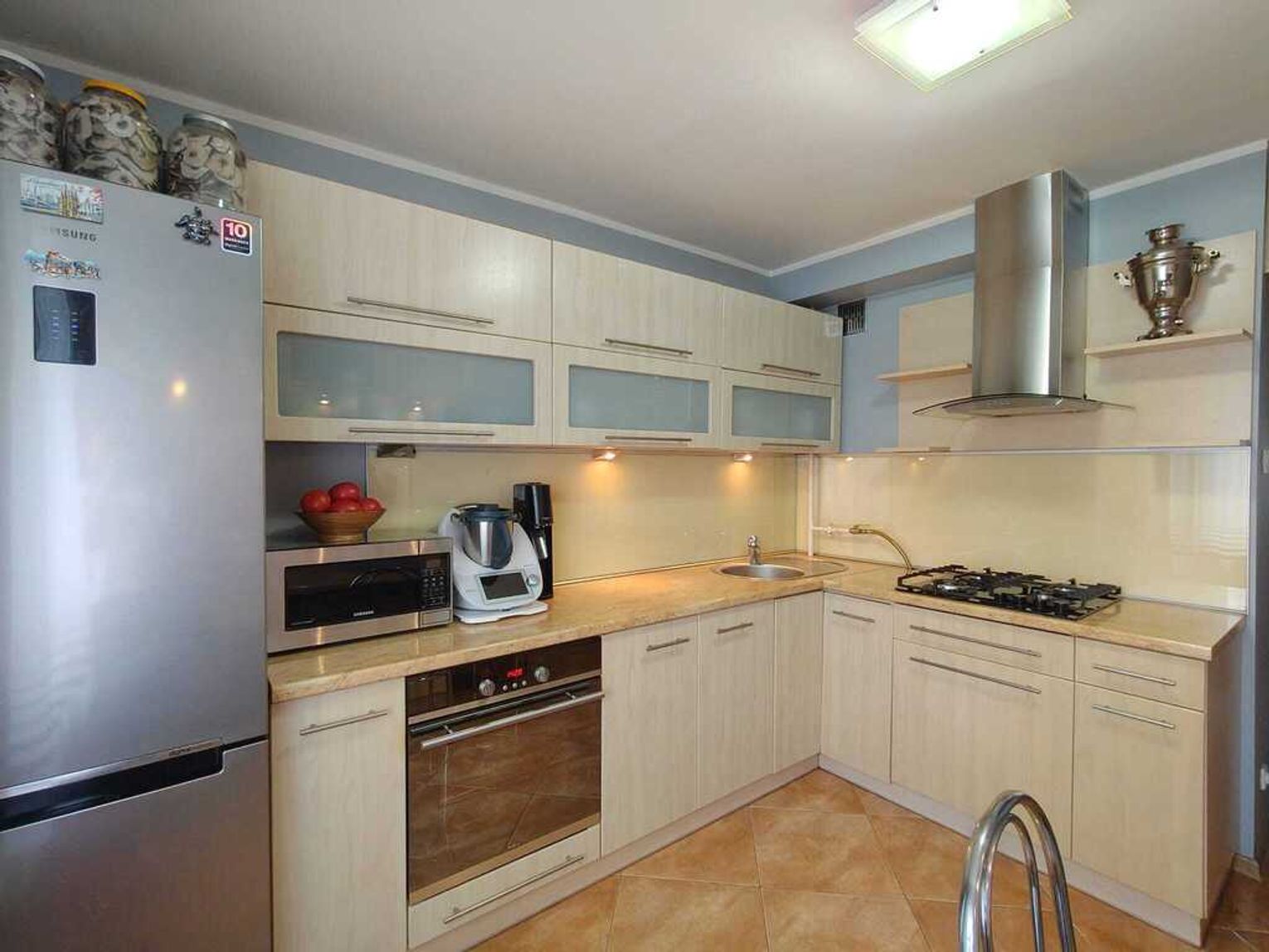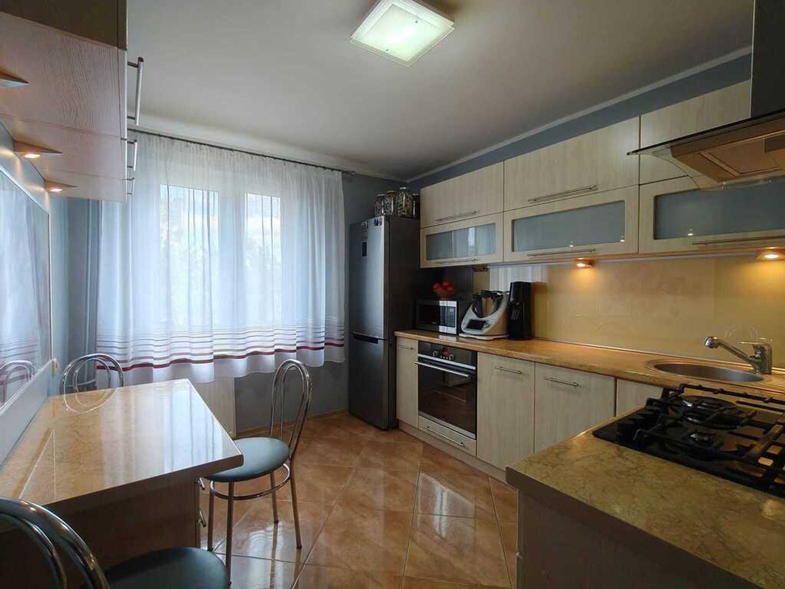 - kuchnia z meblami w zabudowie i sprzętem AGD