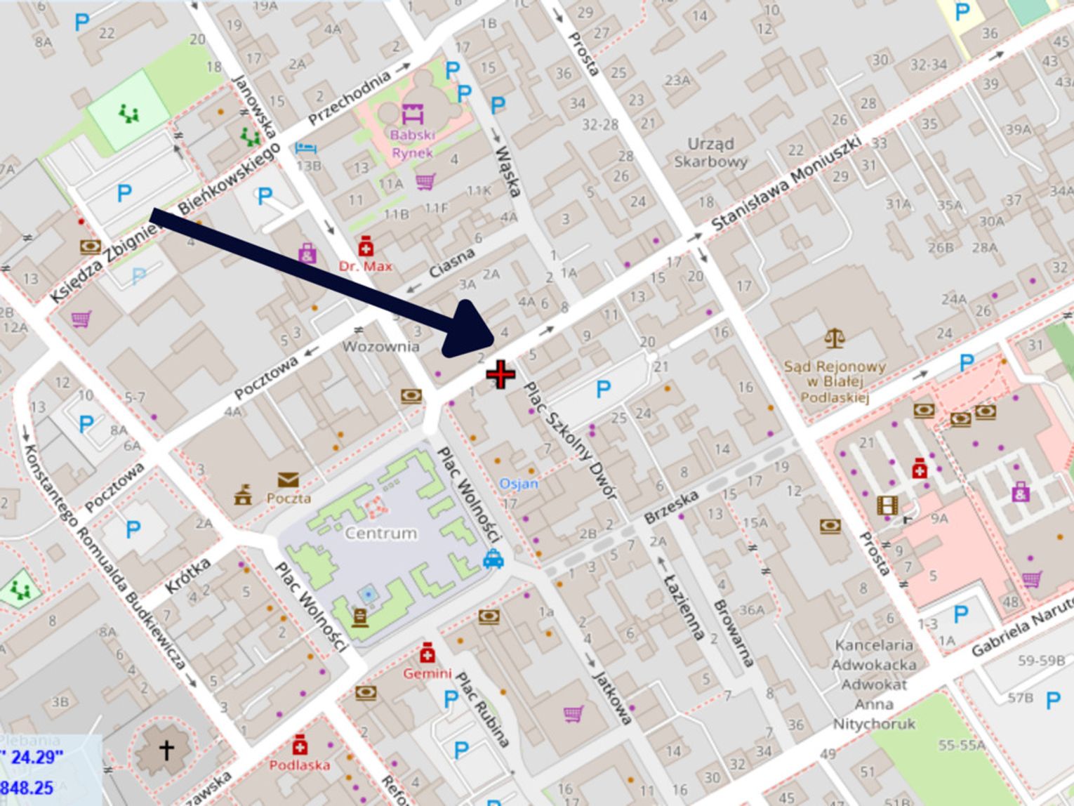 - w pobliżu: rynek, urzędy, banki, sklepy, restauracje