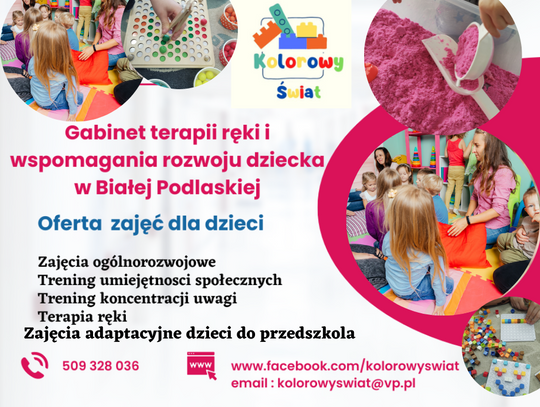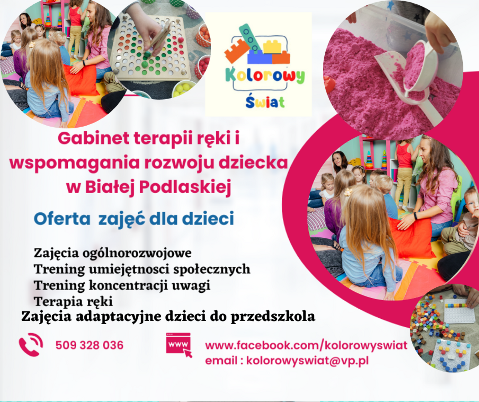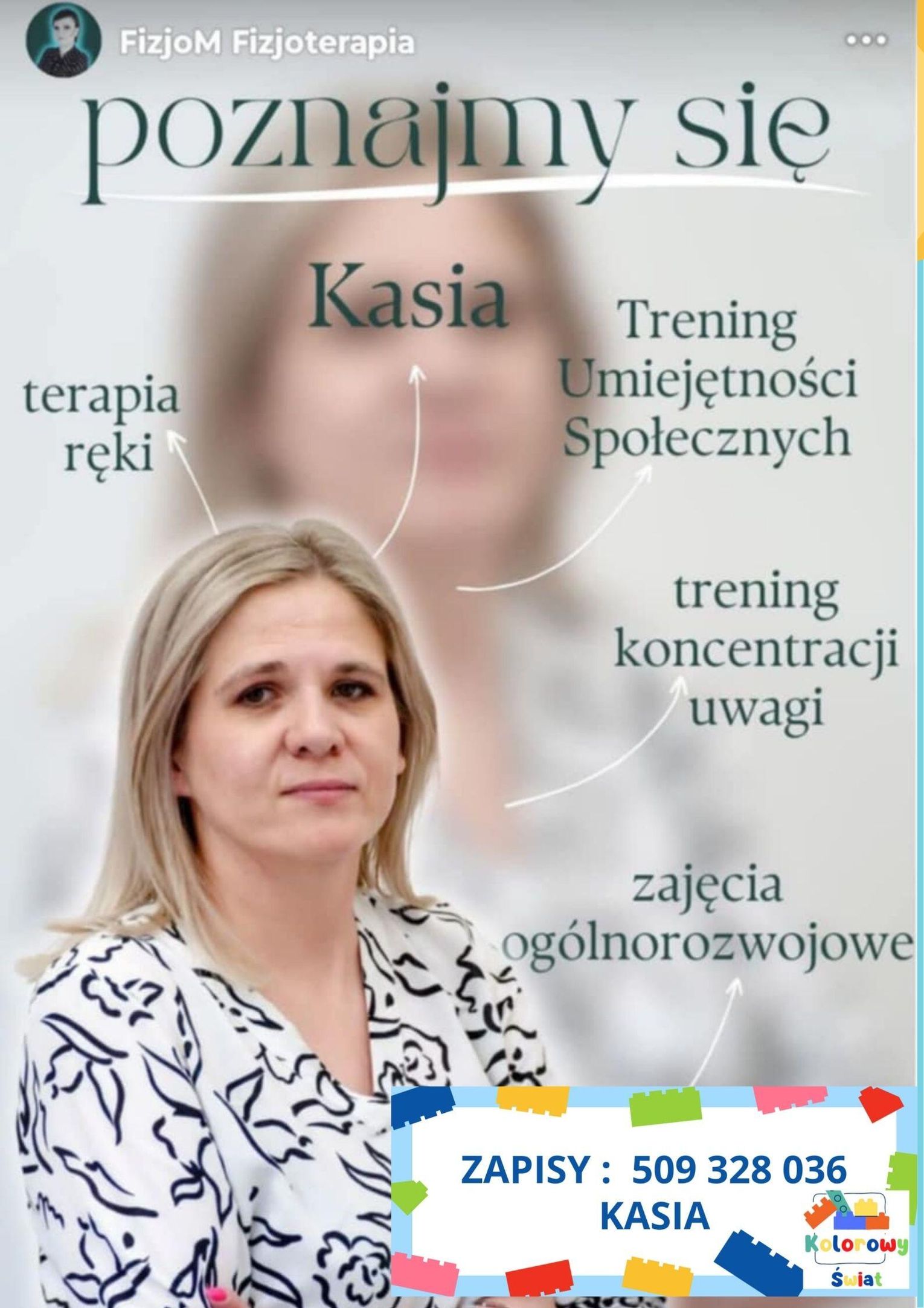Gabinet terapii ręki i wspomagania rozwoju dziecka "" Kolorowy Świat " powstał z myślą o dzieciach .😀🥰 Posiadam wieloletnie doświadczenie w terapii dzieci jako nauczyciel wspomagający i terapeuta. Pracuję w przedszkolu oraz prowadzę indywidualne zajęcia. Każde dziecko jest niepowtarzalne, dlatego staram się zbudować z nim pozytywną relację , indywidualnie dostosowuję metody pracy do każdego dziecka według jego potrzeb i możliwości. Pracuję z dziećmi w wieku 2-10 lat i starszymi, jeśli wymagają kontynuacji terapii Ukończyłam wiele szkoleń i kursów (m.in. Terapia ręki i stopy, trener TUS dla osób z autyzmem zespołem Aspergera , Zaburzenia Koncentracji uwagi , Organizacja wczesnego wspomagania rozwoju dziecka , trening grafomotoryczny , inne) Obecnie współpracuję ze Stowarzyszeniem Osób dorosłych z autyzmem i innymi niepełnosprawnościami , prowadzę także zajęcia terapeutyczne, obserwacje i konsultacje w przedszkolach. Chęć stworzenia dla nich jak najlepszych warunków rozwoju zapoczątkowały myśl o otwarciu swojego własnego gabinetu. Celem było miejsce, w którym każdy mały człowiek będzie mógł liczyć na zrozumienie i indywidualne podejście ze strony terapeuty, a rodzic będzie mógł otrzymać wsparcie, dzięki któremu jego dziecko będzie miało możliwość wszechstronnego rozwoju. U nas łączymy terapię z zabawą, dbamy również o to, by atmosfera była przyjazna dziecku i budziła w nim pozytywne emocje tak, aby czuło się ono dobrze i swobodnie. Do każdego dziecka i jego rodzica podchodzimy indywidualnie, stwarzając warunki, dzięki którym dziecko z trudnościami będzie mogło liczyć na wsparcie i poprowadzenie w odpowiednim kierunku. Zapraszam na prywatne zajęcia z: 😃🙋♂️ - terapii ręki (prowadzę diagnozę i terapię) - treningu umiejętności społecznych - zajęcia z koncentracji uwagi -zajęcia ogólnorozwojowe przygotowujące dzieci do przedszkola Zajęcia przeznaczone są dla wszystkich w szczególności dla dzieci/młodzieży: - z problemami z pisaniem, niestarannym pismem, brakiem umiejętności wycinania, rysowania, malowania, - z problemami emocjonalnymi, nieśmiałością. - z niepełnosprawnością intelektualną, - z opinią, z orzeczeniem, - z dysleksją, dyskalkulią, dysortografią, - z autyzmem, zespołem Aspergera, -mających problem z czynnościami samoobsługowymi (picie z kubka, ubieranie się, zapinanie guzików) -mające znacznie obniżone lub wzmożone napięcie mięśniowe w obrębie kończyny górnej i obręczy barkowej -z nadwrażliwością dotykową oraz niedowrażliwych dotykowo ( dziecko nie lubi zabaw z plasteliną, nie lubi nowych ubrań), -niechętnie podejmujących czynności manualne (np. nawlekanie) -z brakiem koordynacji wzrokowo-ruchowej -wykonujących czynności wymagające dużej precyzji, zbyt wolno lub za szybko i niedbale -problemy grafomotoryczn Więcej informacji udzielę telefonicznie . Zapraszam do zapisów ☎️ 509328036 https://www.facebook.com/kolorowyswiat/