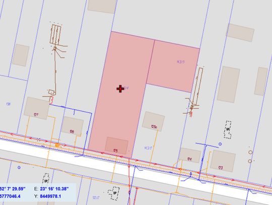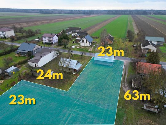 Łączna powierzchnia dwóch działek to około 20 arów – teren płaski, ustawny, z dojazdem. Na działce dostępne są media: woda oraz prąd, co znacząco obniża koszty i czas ewentualnych prac. Otoczenie stanowi typowa zabudowa siedliskowa.